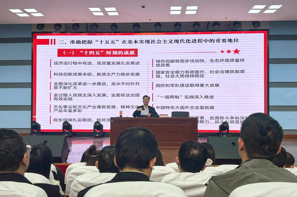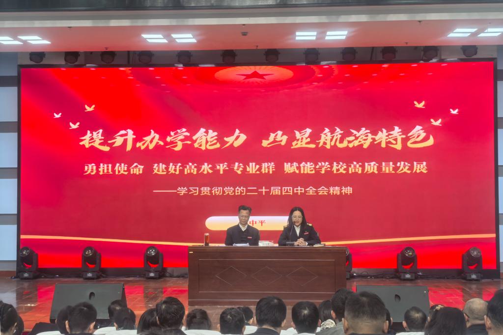 吴中平校长围绕党的二十届四中全会的重大意义、“十五五”在基本实现社会主义现代化进程中的重要地位、十五五”时期经济社会发展的指导方针和主要目标、十五五”时期经济社会发展的战略任务和重大举措等方面展开系统解读。他指出,党的二十届四中全会是在我国全面建设社会主义现代化国家关键时期召开的一次重要会议,全会对坚持和完善中国特色社会主义制度、推进国家治理体系和治理能力现代化作出新部署,为高等教育事业发展指明了前进方向、提供了根本遵循。作为服务国家航运事业、助力海洋强国建设的航海类高校,必须深刻把握全会精神的核心要义和实践内涵,将“坚持和加强党的全面领导”“坚持以人民为中心的发展思想”“坚持新发展理念”等要求融入办学治校全过程,以更高站位、更宽视野谋划学校发展。